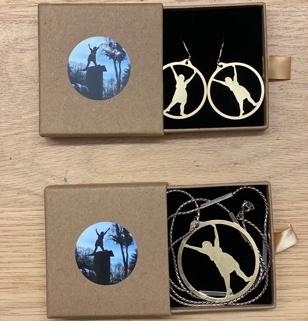 Nu, jaren later, ben ik nog steeds dol op die onstuitbare positiviteit van deze vrouwfiguur. Ik besloot er draagbare miniaturen van te maken. Dezelfde watersnijder die mijn grotere beelden snijdt, sneed deze miniaturen uit messing. Ik polijst ze en monteer ze tot hangers en oorbellen. Nederlands ontwerp en echt Nederlands handwerk.