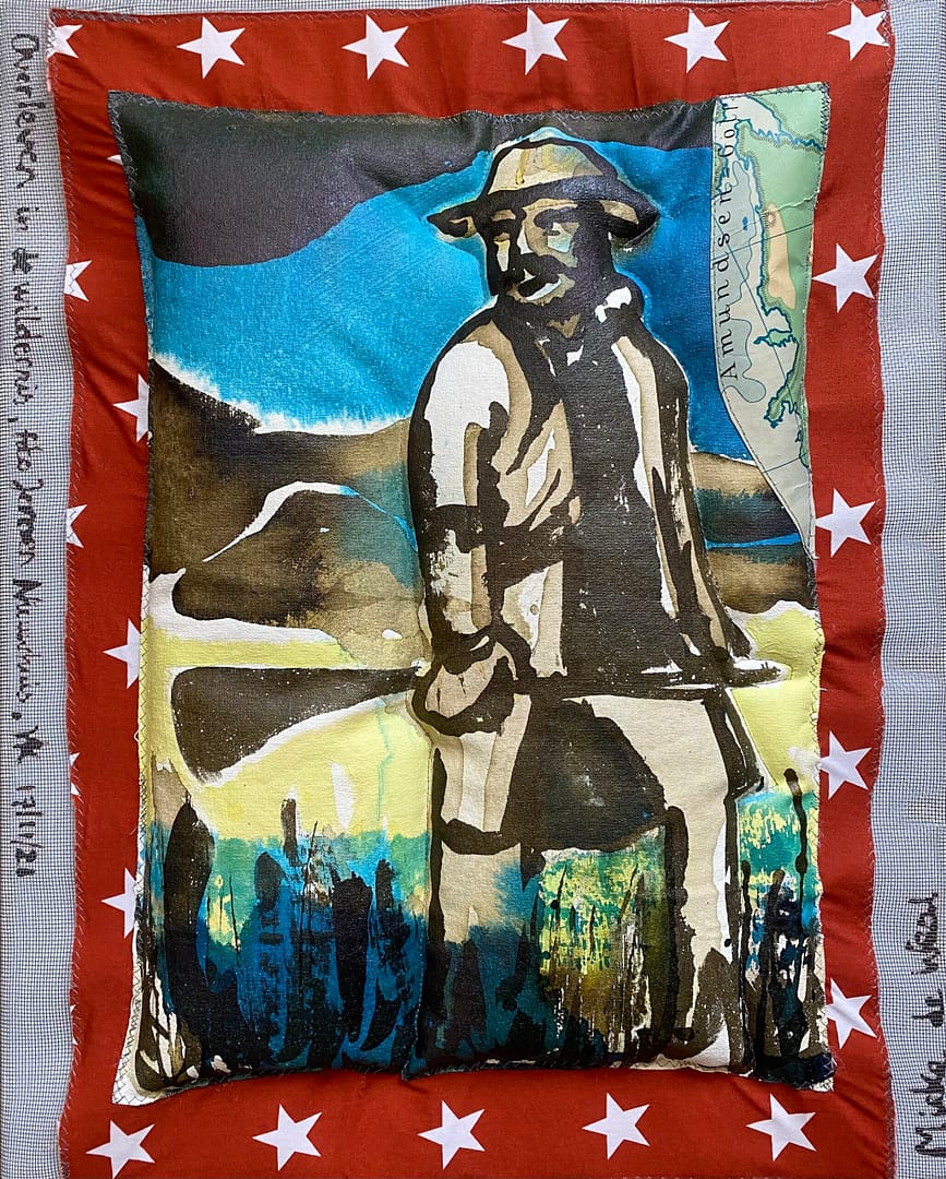 Ik schilderde hoe de man vergroeid raakte met de huiden waarvan zijn kleding was gemaakt. De eenheid met de natuur benadrukte ik door zijn voeten in het gras – en eigenlijk in de bodem – te laten verdwijnen. De stof in de achtergrond verwijst naar de stars and stripes van de Amerikaanse vlag. Die stof kreeg ook een kleurbadje, zodat hij oud lijkt.