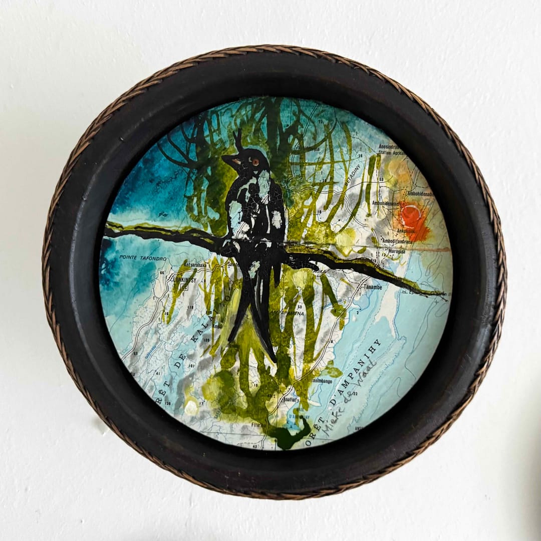 Inkt en acryl op zeekaart, in houten schaal op poot