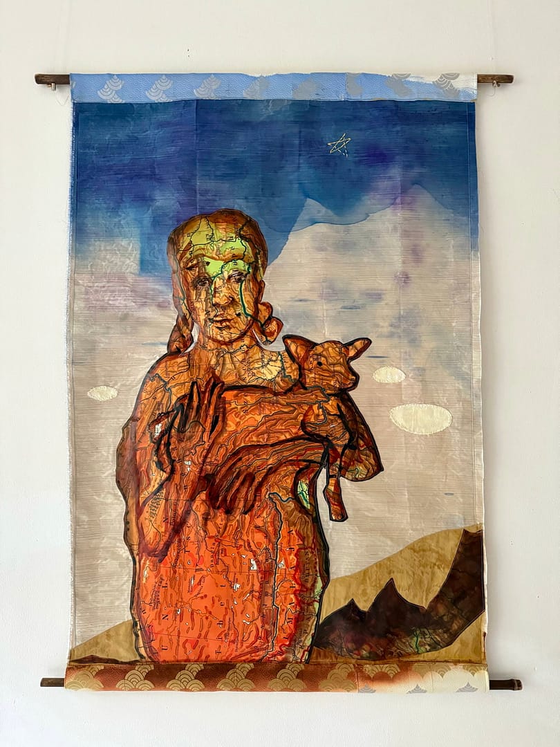Landkaart, zijde, fiberfill, glasvezel, inkt, acryl, borduurzijde, bamboe