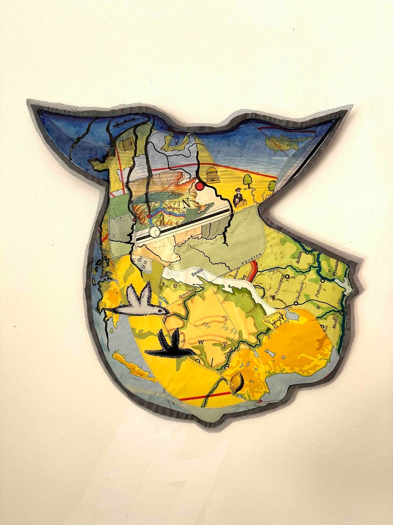 Op veel plaatsen wordt gestreden om grenzen te verleggen en land toe te eigenen. In dit kleine werk voor aan de wand gebruikte ik heel veel stukjes landkaart om die onrustige wereld te verbeelden. Zou die witte duif wat rust kunnen brengen?