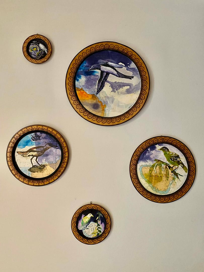 De reeks ‘Fly Away’ bestaat uit een nog groeiend aantal delen, variërend van 14 tot 40 cm doorsnee. Alle vogels zijn in inkt en acryl geschilderd op zee- of landkaart. ‘Ingelijst’ op houten sierbord.