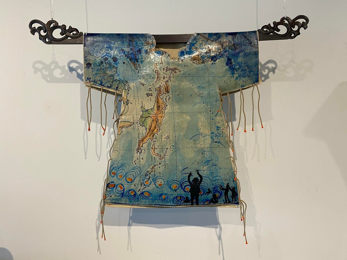 inkt en acryl op landkaart, damast, koord, op houten drager