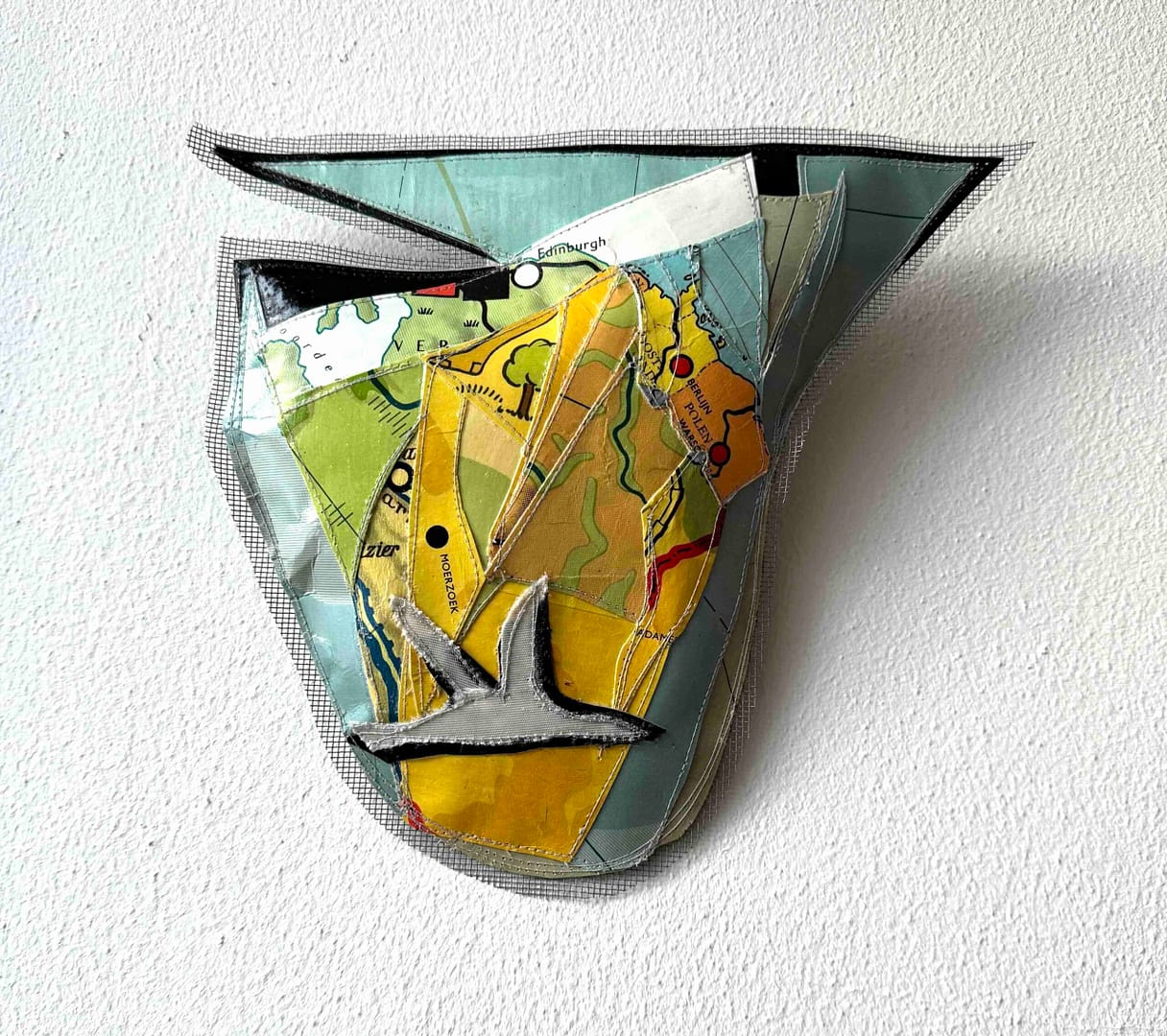 Op veel plaatsen wordt gestreden om grenzen te verleggen en land toe te eigenen. In dit piepkleine werk voor aan de wand gebruikte ik stukjes landkaart om die onrustige wereld te verbeelden. Zou die witte duif wat rust kunnen brengen?