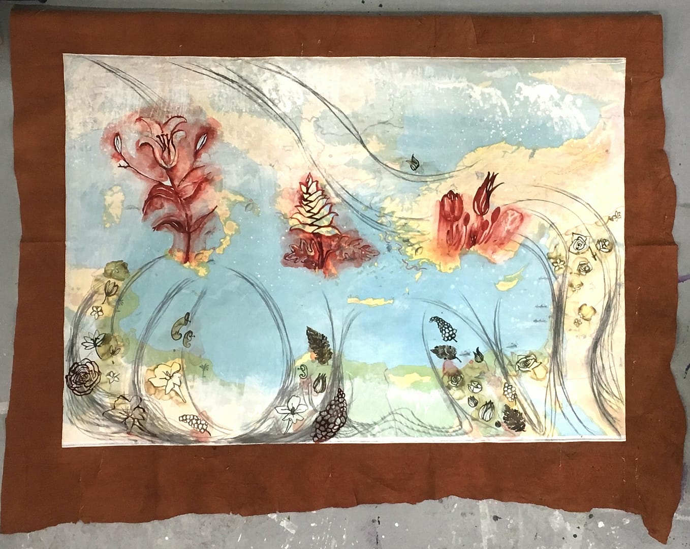 Op een landkaart van het gebied rond de Middellandse Zee verbeeldde ik de migratie vanuit Afrika en Azië naar Europa met nationale bloemen. Je kunt mensen in principe zien als de bloem van hun natie, al moet je natuurlijk oppassen voor ‘giftige’ exemplaren. Sommige bloemen zijn geworteld, andere laten zich vooralsnog meevoeren op de wind.