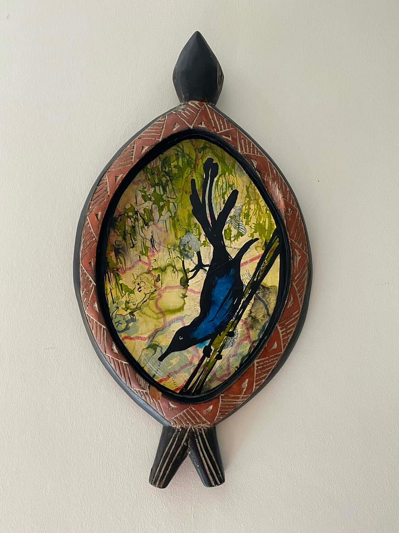 Inkt en acryl op landkaart, op houten dienblad uit Ghana