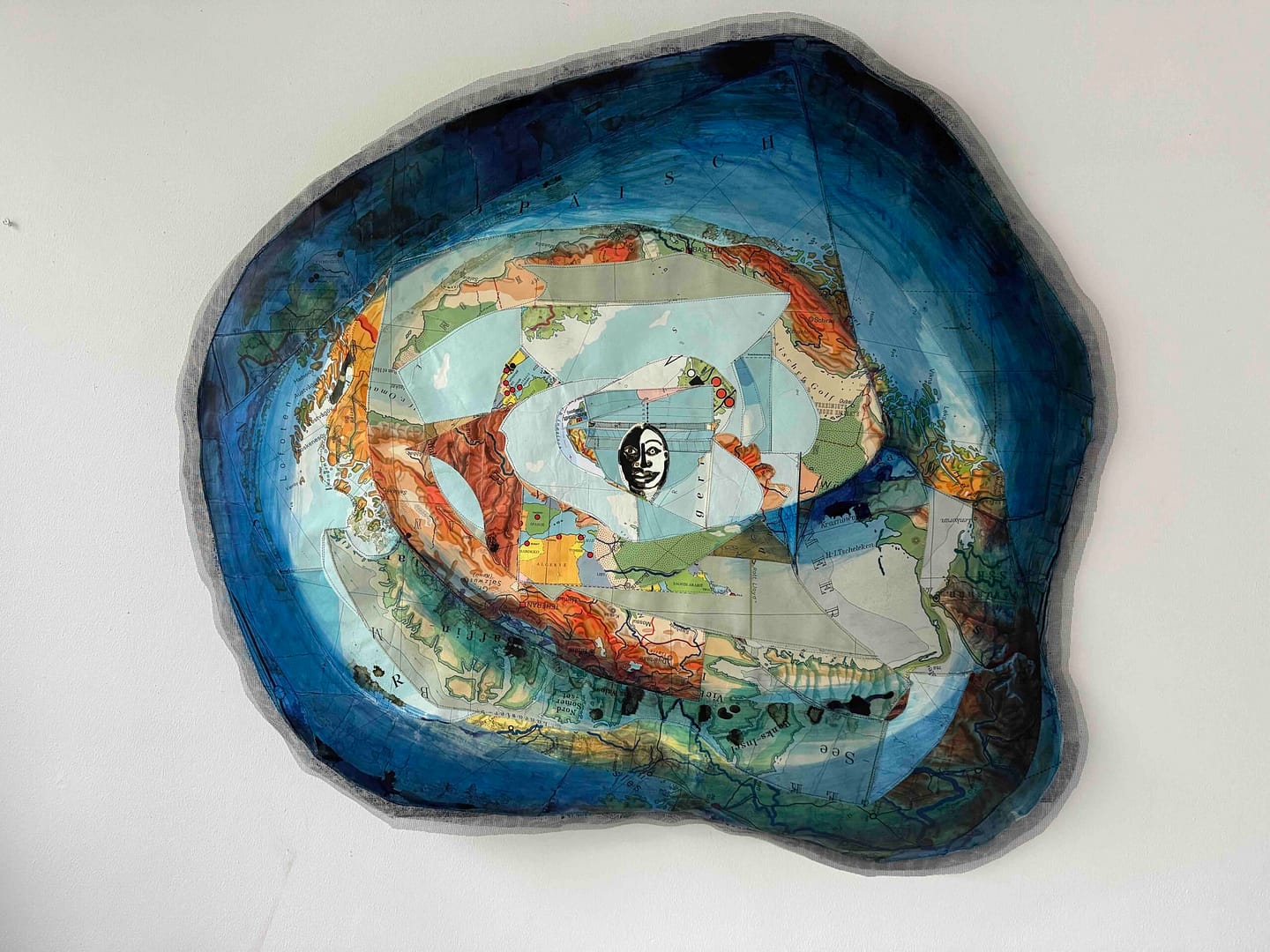 Gemengde techniek: landkaarten, glasvezel, fiberfill, inkt, acryl, bamboe