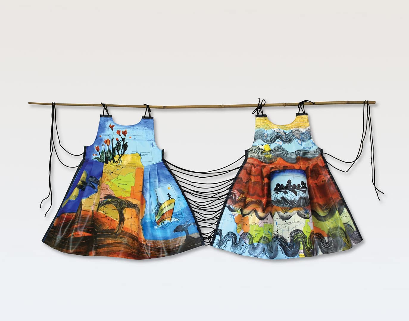 Uit een schoolkaart van Afrika maakte ik twee halve jurkjes, symbool voor de verschillende werelden binnen dat ene continent. Ik beschilderde de helften en verbond ze losjes met koorden. Samen hangen ze nu aan een bamboe stok.