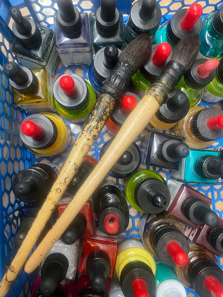 Ik houd van goede materialen om mee te werken. Naast rijk gepigmenteerde kleurechte en watervaste inkt gebruik ik de beste acrylverven, linnen en canvas, zuurvrije papieren, fraaie bedrukte stoffen en originele oude landkaarten.
